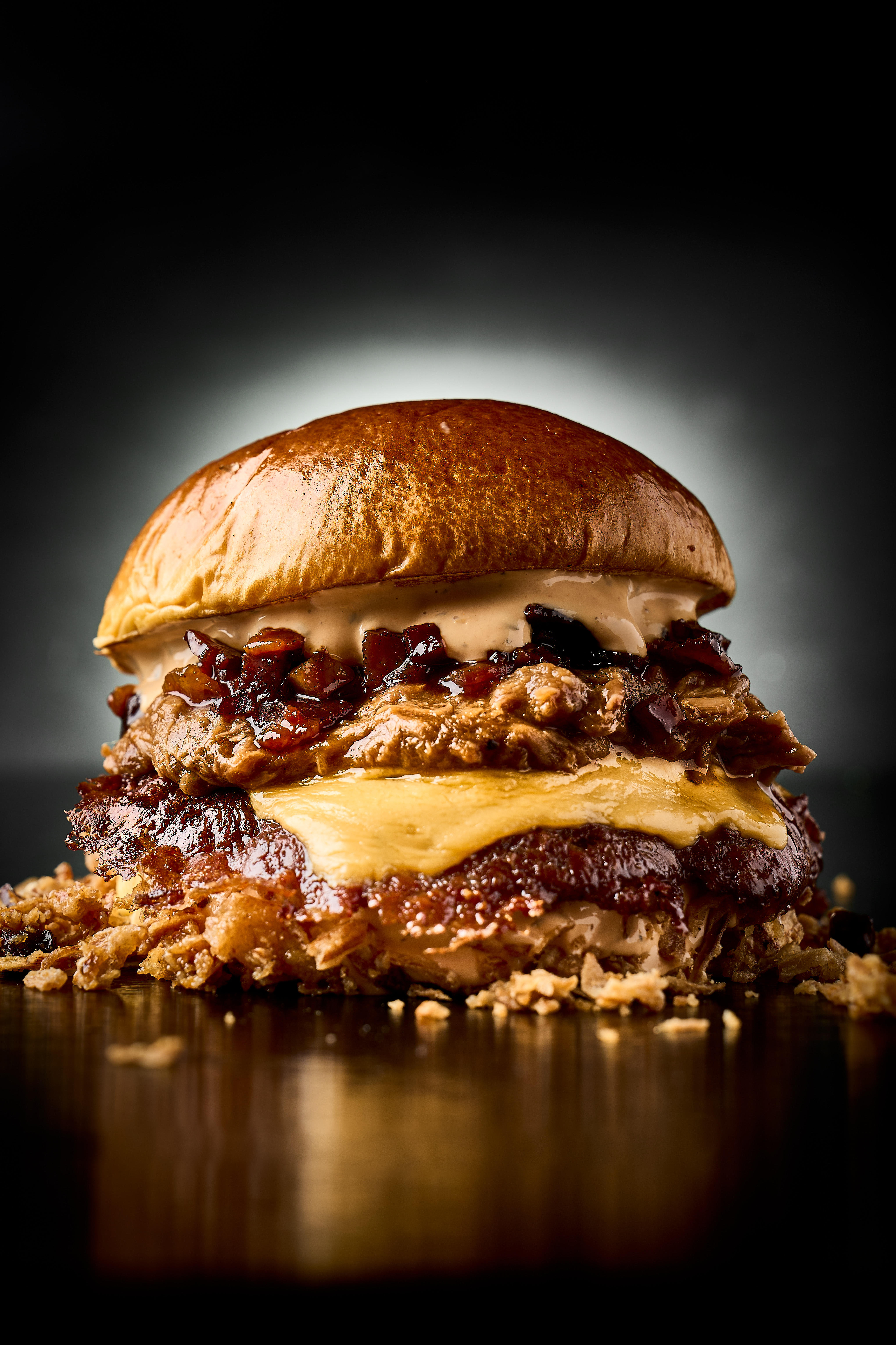 Pan Brioche, Carne Smash de Ternera, Queso cheddar americano, costilla deshilachada a baja temperatura al style Texas, Mermelada de Bacon casera, cebolla crujiente, salsa de bacon ahumada. 17€